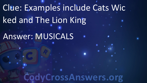 Examples include Cats Wicked and The Lion King Answers