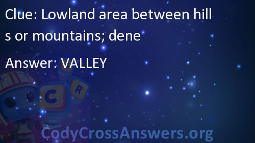 Lowland area between hills or mountains; dene Answers