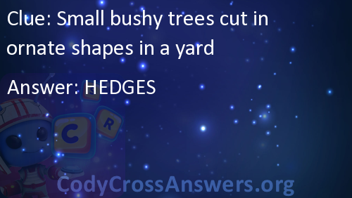 Small bushy trees cut in ornate shapes in a yard Answers
